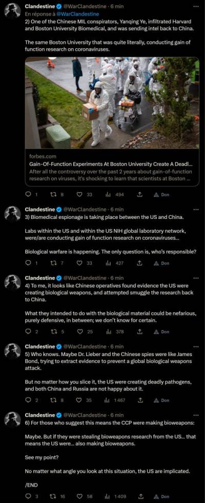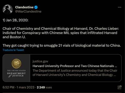 Janvier 2020 des espions Chinois ont volé des virus dangereux dans des laboratoires à Harvard et Boston