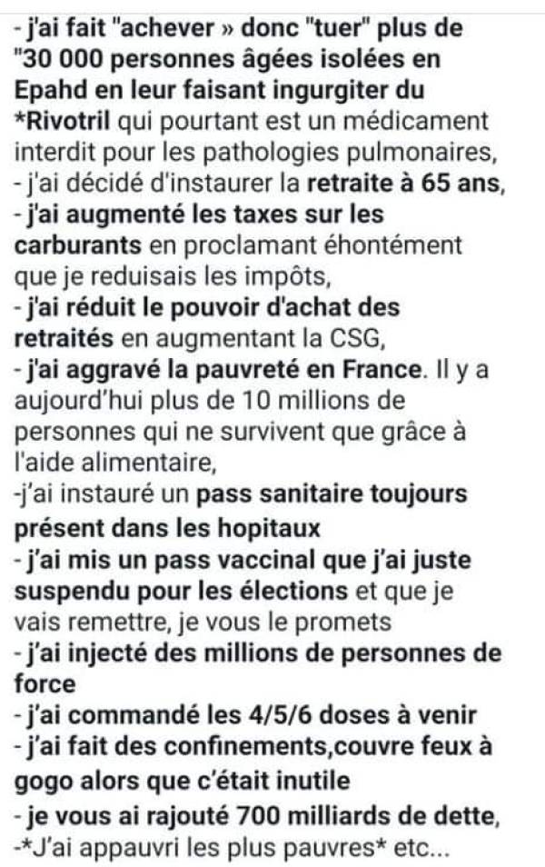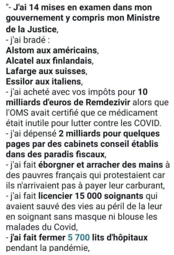 M. Macron est aussi responsable de l'emploi d'armes de guerre contre des manifestants, de l'utilisation de milices étrangères sur le sol de France (affaire Benalla), d'attribution de faux titres militaires et diplomatiques (Affaire Benalla), d'avoir corrompu la justice au point de parvenir à faire condamner les victimes de sévices à la place de ceux qui enfreignent la loi (gilets jaunes, article 431-1), et généralement il est aussi coupable d'atteinte grave aux droits fondamentaux du citoyen, depuis la liberté d'expression à la liberté de circulation en passant par des techniques répressives provoquant morts, mutilations et blessures graves. Ajoutons encore les traités et pactes destinés à augmenter l'immigration au détriment des Français, la mise sous tutelle des réserves d'or auprès d'une banque internationale, la désindustrialisation massive, la réduction progressive de tous les droits sociaux acquis par nos ancêtres, les lois visant à imposer la une pensée unique, et TOUS CES “ÉVÈNEMENTS ÉTRANGES” (manipulations autour de Notre Dame de Paris en vue des futurs jeux olympiques, incendies, enquêtes limitées, classements sans suite des plaintes dérangeantes, etc.).